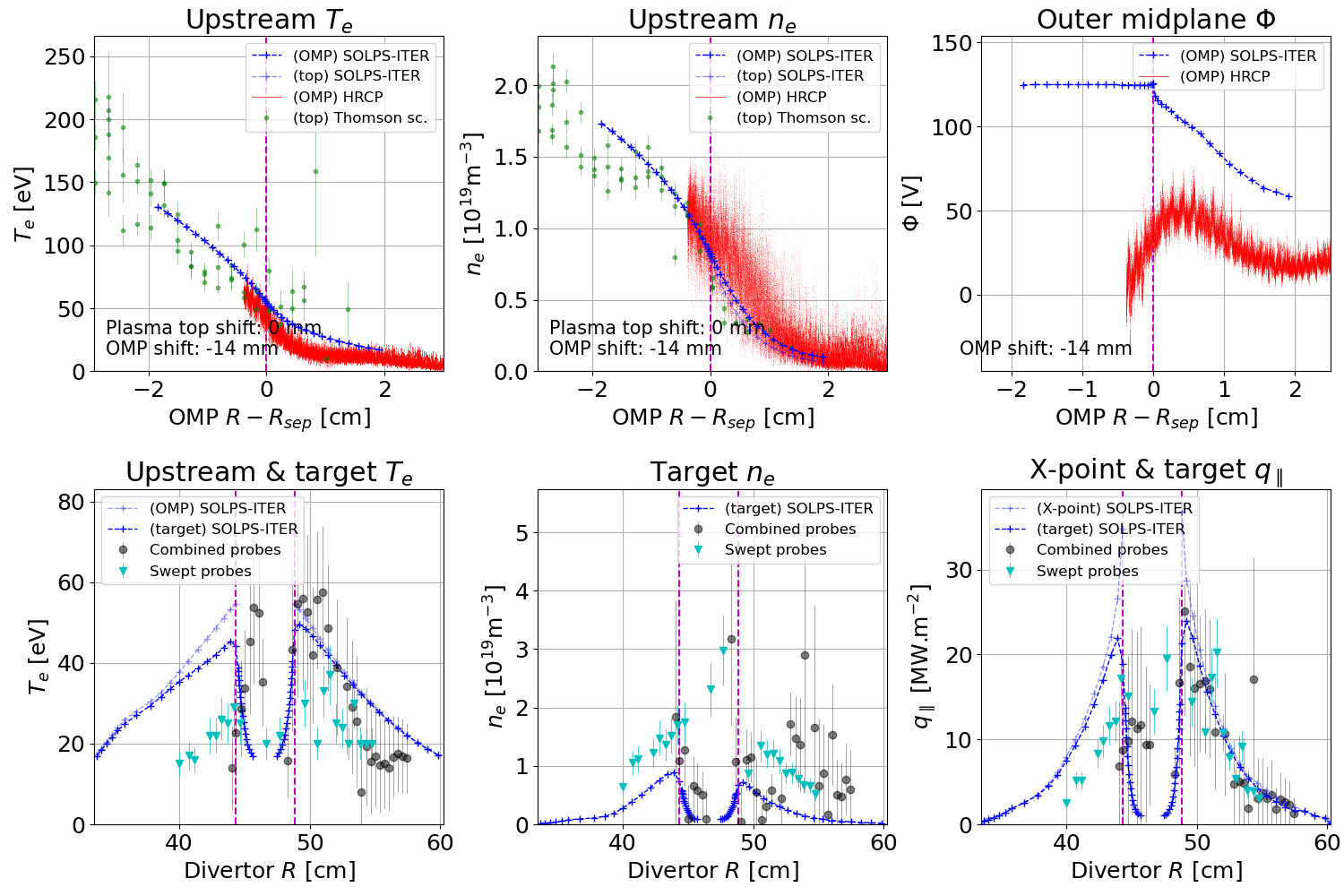 - Ad hoc separatrix corrections. As argued in Kateřina's PhD thesisdownload and in [Švorc 2026 preprintdownload], one can get away with mutually shifting upstream experimental and simulated profiles until a match is achieved. The main argument is that there is a trade-off between separatrix \(n_{e,sep}\) and \(T_{e,sep}\) (at fixed input power), and getting it wrong means matching target profiles is hopeless. The target acts as a canary in the mine: if target plasma parameters are matched, the entire simulation is working.